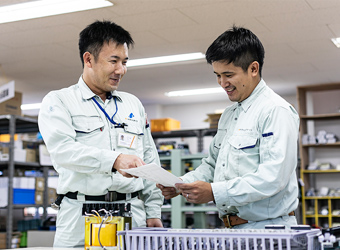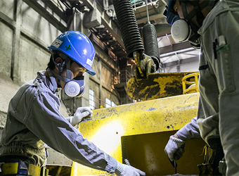 全国のクリーンセンターに納入されたクレーンやバケットの保守メンテナンスを行うのが、私たちサービス員の仕事。当社の製品は人々の暮らしに密着した公共性の高い機器のため、安定性や安全性を堅持しなければなりません。対象製品に関する幅広い知識と技術が必要となり大変ですが、そのぶんやりがいがあり、おもしろみもあります。また、基本的に4人1組で活動するため、チームワークで業務を成し遂げていく喜びを味わえるのもこの仕事の魅力です。